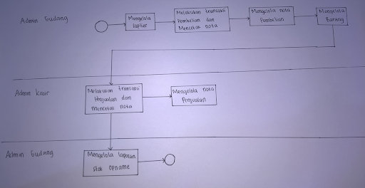 - Admin Gudang yang bertugas mengelola Gudang (data supplier, proses transaksi pembelian barang beserta nota, dan penginputan data barang).